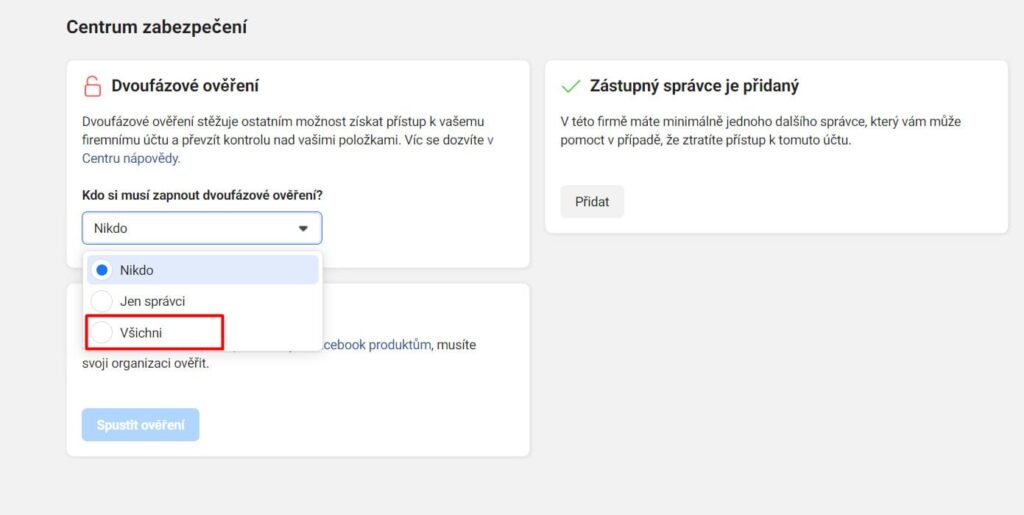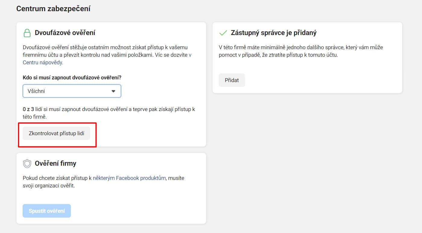 Přejděte do Business Manageru. Vlevo nahoře máte „hamburger menu“ (3 čárky pod sebou). Klikněte na ně a vyberte sekci Nastavení firmy. Pak sjeďte kousek níže a v levém menu se vám objeví sekce Centrum zabezpečení. Pro čisté svědomí a lepší zabezpečení zvolte, že musí mít všichni všichni dvoufázové ověření.