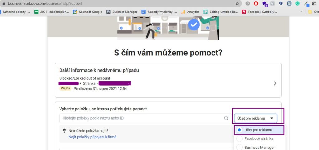 1. Facebook podpora pro reklamní účet (vyberete reklamní účet, který vás trápí)