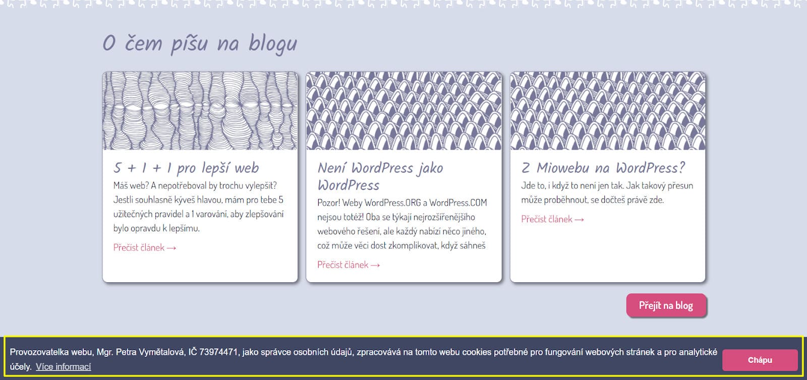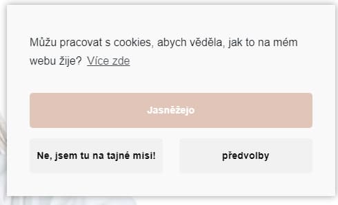 Ukázka moc hezké cookie lišty (opt-out metodou) na petravymetalova.cz. Výstřižek jsem pořídila 3. 11. 2021.